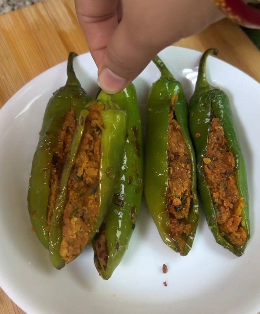 3. मिर्च में भरावन भरें: तैयार बेसन मिश्रण को मिर्च में भरें। सभी मिर्चों को इसी तरह भरें।